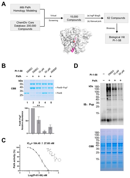 PafA inhibitor Pi-1-58 derived from the computer-aided inhibitor screening assay. (A) The workflow for computer-aided screening of PafA inhibitors. (B) PanB pupylation activity of PafA in the presence of various PafA inhibitors, using 2 mM ABESF as the positive control of PafA inhibitor. Samples were analyzed by SDS-PAGE, followed by Coomassie brilliant blue (CBB) staining. Quantitation of the pupylation level of PanB based on CBB staining is shown in the lower panel. Data are representative of three independent biological replicates (mean and s.e.m. of n = 3 samples), ** p < 0.01 (two-tailed unpaired t-test). (C) Pi-1-58 inhibits PanB pupylation activity of PafA with an IC50 = 184.45 ± 27.65 nM. The graph depicts percent activity relative to DMSO only control (mean ± SD). Chemical structure of Pi-1-58 is shown. (D) E. coli total protein pupylation activity of PafA in the presence of various PafA inhibitors. Samples were analyzed by SDS-PAGE, followed by CBB staining to serve as a loading control and Western blotting with an anti-Pup antibody.