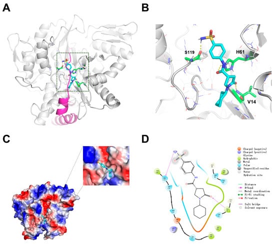 To unveil the molecular mechanism underlying the inhibition of PafA-catalyzed pupylation by Pi-1-58, we performed molecular docking using the Mtb PafA protein structure, derived from homology modeling based on the Cglu PafA (PDB ID:4BJR), and Pi-1-58 []. The results show that Pi-1-58 binds precisely to the S119-adjacent Pup binding pocket (Figure 2A), in line with our previous study identifying this region as an effective inhibitor binding site. We then analyzed the key amino acid residues within the binding pocket that potentially interact with Pi-1-58. Figure 2B presents the local cartoon representation of the PafA–Pi-1-58 complex, emphasizing residues V14, H61, and S119 that form hydrogen bonds with Pi-1-58. The binding pocket was found to be highly conserved between Mtb PafA and Cglu PafA (Figure S1A). We tested the inhibitory effect of Pi-1-58 on Cglu PafA and observed a similar dose-dependent inhibition pattern, further validating our initial model used for inhibitor screening and reinforcing the conservation of the binding pocket (Figure S2). As shown in Figure 2C,D, Pi-1-58 was found to occupy the binding pocket well. Beneath the pocket lies a hydrophobic cavity that accommodates the cyclopentyl group of Pi-1-58, fitting precisely within the hydrophobic environment. This cavity is formed by a pocket defined by the residues V14, F109, and L355, into which the cyclohexane group is embedded. Upon analyzing the scaffold of Pi-1-58 bound to PafA, we observed a tight interaction between the central region of the inhibitor and the binding pocket of PafA. In contrast, the extremities of the molecule appeared to have larger spatial allowances. This finding suggests the possibility for further optimization by modifying the terminal regions to enhance binding affinity and specificity.