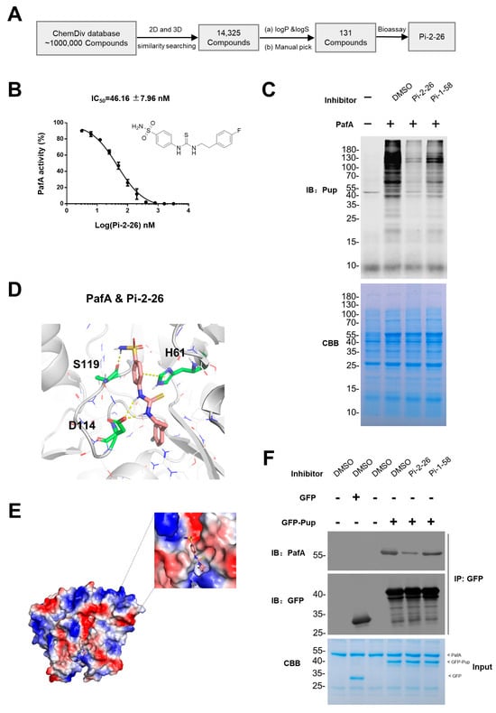 Structure-Based Development of Pi-1-58 Analogs. (A) The workflow for Structure-Based similarity searching of Pi-1-58. (B) Pi-2-26 inhibits PanB pupylation activity of PafA with an IC50 = 46.16 ± 7.96 nM. The graph depicts percent activity relative to DMSO only control (mean ± SD). Chemical structure of Pi-2-26 is shown. (C) E. coli total protein pupylation activity of PafA in the presence of various PafA inhibitors. Samples were analyzed by SDS-PAGE, followed by CBB staining to serve as a loading control and Western blotting with an anti-Pup antibody. (D) Interaction details between Pi-2-26 (salmon stick) and PafA (white cartoon). Residues within 6 Å of Pi-2-26 are shown as white lines. Interacting residues are shown as green sticks and labeled. (E) Electrostatic surface potential map of PafA-Pi-1-58 (cyan stick) complex. Red and blue areas mean negative and positive electrostatic potentials, respectively. (F) Co-immunoprecipitation verification of the Pi-binding site. PafA, in the presence of different PafA inhibitors, was incubated with GFP-tagged Pup or GFP. The mixture was then incubated with anti-GFP immunomagnetic beads. After incubation, the beads were washed to remove unbound proteins, and the bound proteins were eluted for further analysis. Input samples were analyzed by SDS-PAGE, followed by CBB staining. Enriched samples were analyzed by Western blotting with anti-PafA antibody and anti-GFP antibody.