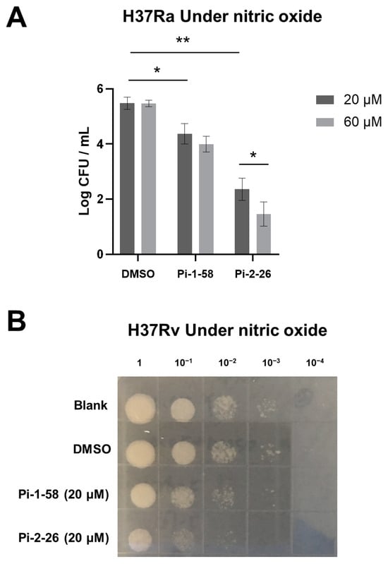 2.4. Pi-1-58 and Pi-2-26 Inhibit Mtb Growth Under Nitric Oxide Stress