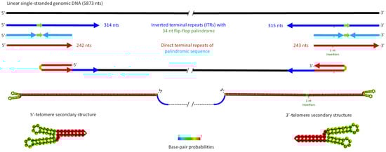 Structures of Myzus persicae densovirus (MpDV) 5′- and 3′-inverted terminal repeats (ITRs) forming symmetrical Y-shaped hairpin telomeres. The 5873 nt linear single-stranded genomic DNA encapsidated in MpDV virions is depicted as a solid black line. Imperfect inverted repeats of the 314 nt 5′-ITR and the 315 nt 3′-ITR sequences that differ by an inversion of a 34 nt flip-flop palindrome and a 1 nt insertion are depicted as blue arrows. Small green arrows indicate the positions of the flip-flop palindrome within each ITR. Near-perfect 242 and 243 nt direct terminal repeats of the palindromic sequences that differ by the 1 nt insertion in the 3′-repeat are depicted as red arrows with the inserted nucleotide position indicated and also as converging cyan arrows connected by small green arrows representing the flip-flop palindrome. Secondary structures of the 5′ and 3′-telomers, predicted using Matthews model’s DNA parameters at 30 °C at Webserver http://rna.tbi.univie.ac.at/cgi-bin/RNAWebSuite/RNAfold.cgi (accessed on 1 October 2024), are depicted both schematically and as images exported from the Webserver. Symmetrical Y-shaped tops of the 5′- and 3′-telomers are enlarged. Color code indicates base pair probabilities ranging from 0 (blue) to 1 (red).