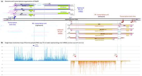 To analyze MpDV gene expression, we performed Illumina sequencing of a poly(A)-enriched fraction of aphid RNA, followed by de novo assembly of viral mRNAs using Trinity (Figure S2) and quantitative analysis of redundant reads mapped on the viral genome (Datasets S1 and S2a). The results revealed converging Pol II transcription units spanning the non-structural (NS) protein genes in the rightward direction and the virion protein (VP) genes in the leftward direction (Figure 2), which is typical for ambisense densoviruses ([27,28]; https://ictv.global/report/chapter/parvoviridae/parvoviridae (accessed on 1 October 2024)).