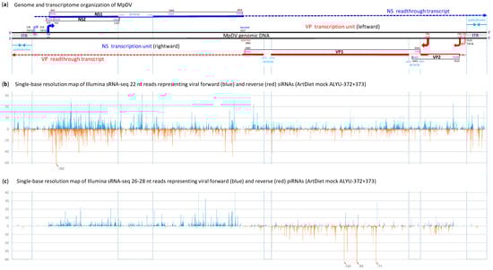 Small RNAome of Myzus persicae densovirus (MpDV) revealed by Illumina sRNA-seq analysis of M. persicae aphids. (a) Genome and transcriptome organization of MpDV. Viral genomic (forward and reverse) ssDNA molecules are depicted as black lines, with positions of the inverted terminal repeats (ITRs) shown as gray boxes. Major and minor transcription start sites (TSSs) of the rightward non-structural (NS) and leftward virion protein (VP) genes are shown with blue and red bent arrows, respectively. Viral mRNAs transcribed from the NS and VP units are depicted with blue and red solid lines, respectively, with positions of ORFs and introns indicated. Dashed lines depict the rightward and leftward readthrough transcripts and the transcripts initiated within ITRs. (b,c) Single-base resolution map of Illumina 22 nt reads (b) and combined 26–28 nt reads (c) representing viral siRNAs and piRNAs, respectively. The reads were mapped to the MpDV genome, and the mapping data were analyzed using MISIS-2 [30] and visualized using Excel (Dataset S4a). The maps of combined reads from 2 biological replicates under one of the 4 feeding conditions (ArtDiet mock ALYU-372+373; Dataset S3) are presented as histograms that plot the numbers of 22 nt (b) and 26–28 nt (c) reads at each nucleotide position of the 5873 nt MpDV genome: blue bars above the axis represent forward reads starting at each respective position, while red bars below the axis represent reverse reads ending at the respective position. Vertical dotted lines indicate positions of the 5′- and 3′-palindromes and the 5′- and 3′-splice sites of NS and VP introns. The red bars exceeding the values of 60 (b) or 40 (c) unique reads were cut off and the reads’ numbers indicated. Complete histograms for each of the 4 conditions are shown in Dataset S4a.