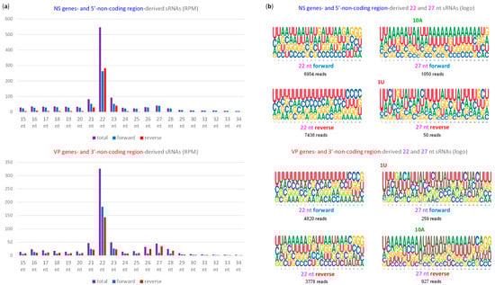 Notably, uridine at position 1 is the second most frequent nucleotide in 26–28 nt sRNAs derived from the mRNA sense strands of each unit (Figure 4b and Figure S6), suggesting that the viral mRNAs may additionally but less efficiently be targeted by the Zucchini-like endonuclease generating precursors of primary 1U-piRNAs. Likewise, adenosine at position 10 is the second most frequent nucleotide in 26–28 nt sRNAs derived from the antisense strands of each unit (Figure 4b and Figure S6), suggesting that the antisense readthrough transcripts can additionally but less efficiently generate secondary 10A-piRNAs, following cleavage by the less abundant primary 1U-piRNAs produced from (pre-)mRNAs. Notably, 26–28 nt reads cover not only exons and introns but also exon–intron junctions at both 5′ and 3′ splice sites of NS and VP units (Figure 3c and Figure S5; Dataset S4a), suggesting that unspliced polyadenylated mRNAs or unprocessed pre-mRNAs can also serve as piRNA precursors.