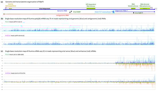 Analysis of single-base resolution maps of the Illumina mRNA-seq reads (Dataset S4b) revealed that the entire positive-sense (gRNA) strand of MpFV genome is almost uniformly covered with low-abundance reads, with the 5′- and 3′-terminal regions exhibiting lower and higher read density, respectively (Figure 6b and Figure S9a; Dataset S4a). On the other hand, the negative-sense strand (antigenomic RNA) is represented by a very low number of reads, mostly derived from the 3′-part of the MpFV genome (Figure 6b and Figure S9a; Dataset S4b). This finding likely reflects the low abundance of antigenomic RNA as the replicative intermediate (Figure 6a).