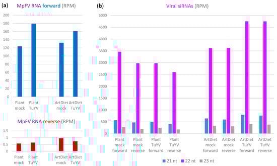 Impact of aphid feeding conditions on Myzus persicae flavivirus (MpFV) replication and antiviral RNAi responses. Illumina mRNA- and sRNA-seq reads from aphids fed on mock-inoculated or TuYV-infected plants (Plant mock, Plant TuYV) or artificial diets without or with TuYV virions (ArtDiet mock, ArtDiet TuYV) were mapped with zero mismatches to the MpFV genome and the mapped reads were sorted by size and polarity (forward, reverse) and counted in reads per million (RPM) of total (host + viral) reads (Datasets S1 and S3). Counting results for combined reads from three (mRNA-seq) and two (sRNA-seq) biological replicates per feeding condition are presented as bar graphs. (a) Counts of mRNA-seq forward reads representing MpFV genomic RNA (blue bars) and mRNA-seq reverse reads representing MpFV antigenomic RNA (red bars). (b) Counts of each size class of 21–23 nt forward and reverse sRNA reads representing viral sense and antisense siRNAs derived from MpFV genomic and antigenomic RNAs, respectively.