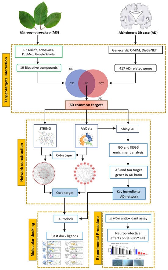 SH-SY5Y cells, derived from human neurons, replicate the human neuronal response to excess ROS and are utilized to investigate neurodegenerative diseases [23]. Continuous growth, immature neuronal proteins, and a low density of neuronal markers mark this cell line [24]. Network pharmacology, as first introduced by Hopkins, merges systems and computational biology to elucidate the connections between metabolites, targets, and diseases, facilitating drug discovery and providing insights into drug-organism interactions [25]. Integrating bioinformatics and network pharmacology through computational predictions is a robust approach to uncovering the relationships between biological mechanisms, complex diseases, and drug effects [26]. Molecular docking technology further investigates interactions between small molecules and larger biological macromolecules [26]. This study uniquely combines network pharmacology with molecular docking and in vitro validation to explore how M. speciosa may treat AD, focusing on identifying essential compounds and targets for effective multi-target strategies. The technological roadmap for this methodology is depicted in Figure 1. The findings from this research could offer additional understanding of the molecular processes and treatment strategies for AD and its associated effects.