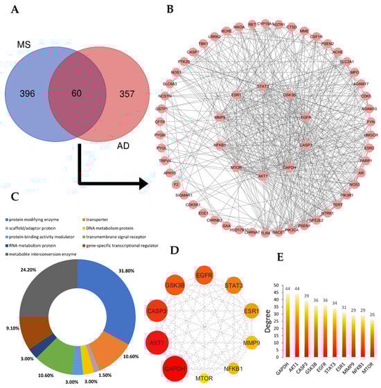 We have generated a network diagram illustrating the overlap of 60 genes associated with MS and AD targets (Figure 2B). These genes have been categorized based on cell function, resulting in nine distinct categories. Notably, protein-modifying enzymes, accounting for 31.8% of the identified genes, constitute the largest proportion (Figure 2C). This category encompasses critical enzymes such as GSK3B, TBK1, CASP7, PTK2B, F2, APH1B, PSEN1, AKT1, ADAM17, MTOR, BACE1, PSEN2, CDK5, FYN, ADAM10, CTSD, CASP3, and metalloproteases MME, ECE1, and MMP9. Human PPI data were obtained from STRING (Table S3) and filtered using medium confidence 0.4 to establish the PPI. The resulting PPI network comprises 60 nodes and 470 edges, representing distinct PPIs. The average node degree is determined to be 15.7, and the local clustering coefficient is 0.635, signifying the interconnectedness of the targets within the network. The PPI network was further analyzed using Cytoscape 3.10.2, and core targets were identified by CentiScaPe 2.2 Menu based on their degree, closeness, and betweenness centrality measures (Table S4). From this analysis, 10 hub genes were identified, including GAPDH, AKT1, CASP3, GSK3B, EGFR, STAT3, ESR1, MMP9, NFκB1, and MTOR, as depicted in Figure 2D,E.