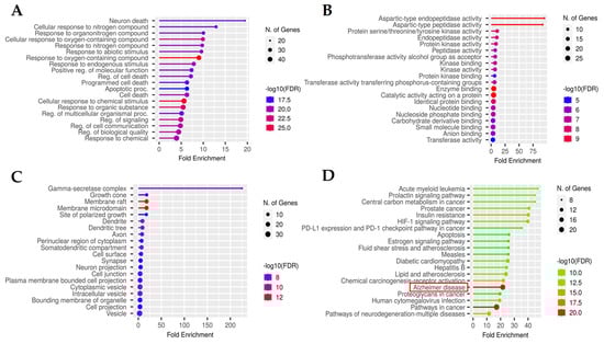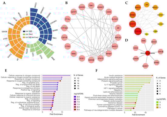 To narrow down the genes associated with the pathogenesis of AD, we sought to correlate the genes with the amyloid deposition hypothesis and tau phosphorylation hypothesis, as these are the primary hallmarks of AD [29]. We utilized the AlzData database to analyze the Aβ or tau pathology and identified 20 targets (Figure 4A–D). These 20 targets were further used to construct a PPI network and perform BP and KEGG analysis. The enrichment analysis of BP pathways included response to organic substances, regulation of biological quality, cellular response to chemical stimulus, response to oxygen-containing compounds, regulation of signaling, response to chemicals, regulation of cell communication, and more. The results of the KEGG analysis indicated that these targets were primarily enriched in pathways in cancer, Alzheimer’s disease, insulin resistance, prostate cancer, measles, lipid and atherosclerosis, and others (Figure 4E,F).
