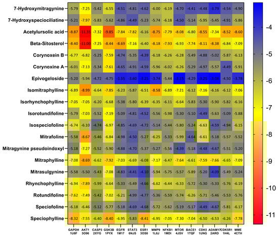 The heat map of docking score from MS and core targets (kcal/mol). Energy values were all negative, with a more negative score (red) and more binding energy.