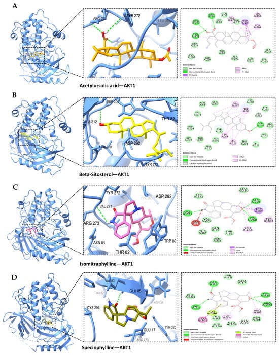 The docked complexes of AKT1 demonstrate significant binding affinities for MS compounds and hydrogen bonds: (A) acetylursolic acid-AKT1, (B) beta-sitosterol-AKT1, (C) isomitraphylline-AKT1, (D) speciophylline-AKT1. Target interaction residues are highlighted as green sticks.