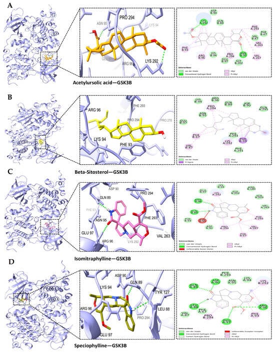 The docked complexes of GSK3B demonstrate significant binding affinities for MS compounds and hydrogen bonds: (A) acetylursolic acid-GSK3B, (B) beta-sitosterol-GSK3B, (C) isomitraphylline-GSK3B, (D) speciophylline-GSK3B. Target interaction residues are highlighted as green sticks.