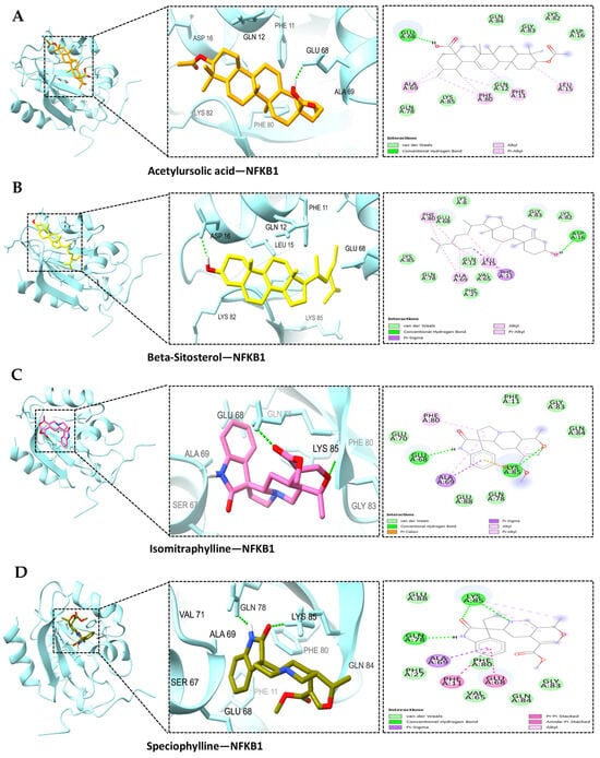 The docked complexes of NFκB1 demonstrate significant binding affinities for MS compounds and hydrogen bonds: (A) acetylursolic acid-NFκB1, (B) beta-sitosterol-NFκB1, (C) isomitraphylline-NFκB1, (D) speciophylline-NFκB1. Target interaction residues are highlighted as green sticks.
