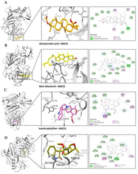 The docked complexes of BACE1 demonstrate significant binding affinities for MS compounds and hydrogen bonds: (A) acetylursolic Acid-BACE1, (B) beta-Sitosterol-BACE1, (C) isomitraphylline-BACE1, (D) speciophylline-BACE1. Target interaction residues are highlighted as green sticks.