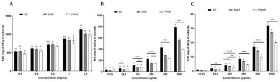 The total alkaloid, phenolic, and flavonoid contents of EE, DWE, and PHWE of M. speciosa leaves: (A) the total alkaloid content, (B) the total phenol content, (C) the total flavonoid content. The results of the experiments were expressed in mg of AE/g, GAE/g, and QE/g of the extract of the mean ± standard error of the means (SEM) (n = 3). TAC = total alkaloid content, TPC = total phenolic content, TFC = total flavonoid content, EE = ethanolic extract, DWE = distilled water extract, PHWE = pressurized hot water extract. a, b, c, d; e, f, g, h; and i, j, k, l denote comparison between the concentrations of EE, DWE, and PHWE, respectively. * denotes the comparison between EE, DWE, and PHWE. *, a, e, i, p < 0.05; **, b, f, j, p < 0.01; ***, c, g, k, p < 0.001; ****, d, h, l, p < 0.0001; ns, non-significant.