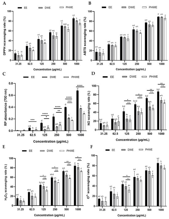 Antioxidant activities of different concentrations of EE, PHWE, and DWE (31.25–1000 μg/mL) as determined by (A) DPPH free radical-scavenging assay, (B) ABTS free radical-scavenging assay, (C) reducing power assay, (D) nitric oxide radical-scavenging assay, (E) hydrogen peroxide scavenging assay, and (F) scavenging of superoxide radical by alkaline DMSO method. The results of the experiments were expressed as the mean ± standard error of the means (SEM) (n = 3). EE = ethanolic extract, DWE = distilled water extract, PHWE = pressurized hot water extract. a, b, c, d; e, f, g, h; and i, j, k, l denote comparison between the concentrations of EE, DWE, and PHWE, respectively. * denotes the comparison between EE, DWE, and PHWE. *, a, e, i, p < 0.05; **, b, f, j, p < 0.01; ***, c, g, k, p < 0.001; ****, d, h, l, p < 0.0001; ns, non-significant.