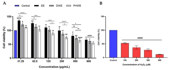 SH-SY5Y cells were treated with different concentrations of extracts and H2O2 to determine the cytotoxicity. (A) SH-SY5Y cells were exposed to 31.25–600 μg/mL of EE, DWE, and PHWE for 24 h, (B) H2O2 (100–400 μM) towards SH-SY5Y cell. The results of the experiments were expressed as the mean ± standard error of the means (SEM) (n = 3). EE = Ethanolic extract, DWE = Distilled water extract, PHWE = Pressurized hot water extract. # denotes compared to control (untreated), and * denotes the comparison between EE, DWE, and PHWE. #, *, p < 0.05; ##, p < 0.01; ***, p < 0.001; ####, ****, p < 0.0001; ns, non-significant.
