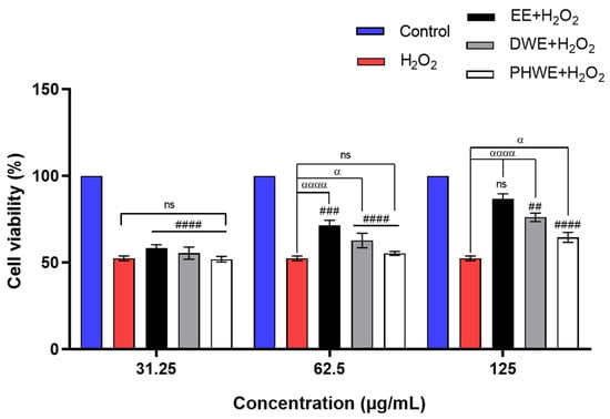 SH-SY5Y cells were treated with EE, DWE, and PHWE (31.25, 62.5, and 125 μg/mL) concentrations for 24 h after induced 100 μM H2O2. The results of the experiments were expressed as the mean ± standard error of the means (SEM) (n = 3). (α p < 0.05, αααα p < 0.0001) compared to H2O2-treated cell; (## p < 0.01, ### p < 0.001, #### p < 0.0001, ns: non-significant) compared to control (untreated). EE = ethanolic extract, DWE = distilled water extract, PHWE = pressurized hot water extract.