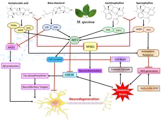 The constituents of M. speciosa interact with multiple targets and pathways to inhibit neurodegeneration.