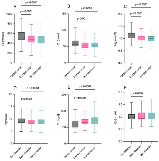 Maternal whole blood metal ion concentrations across pregnancy. (A–D) Levels of Fe, Zn, Mg, and P declined with advancing gestation. (E) Cu concentrations showed a significant increase during the second and third trimesters. (F) Ca levels increased in the second trimester versus the first trimester. Standard deviations of the means are indicated. Group comparisons were conducted using the Friedman test. Sample size: n = 206. Significance level: p < 0.05.