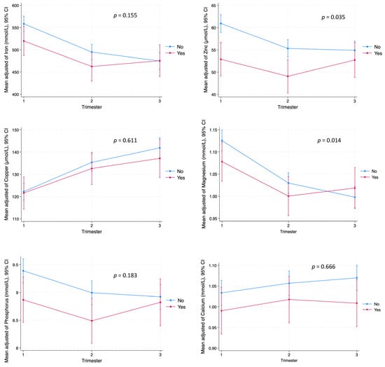 Mixed-effects analyses explored the interactions between preexisting metabolic conditions and metal ion statuses (Table S2). Zn levels significantly varied across the trimesters, being influenced by hypothyroidism diagnoses (p = 0.035) (Figure 2). Similarly, Mg levels showed significant variation associated with hypothyroidism (p = 0.014). However, other conditions and pregestational body mass index (pBMI) categories, while showing patterns of change, did not reach statistical significance (Table S2 and Figure S2).