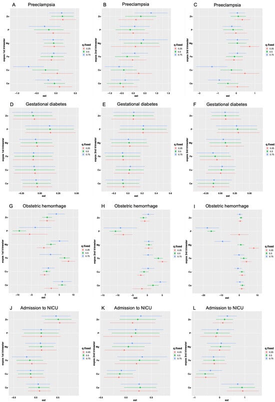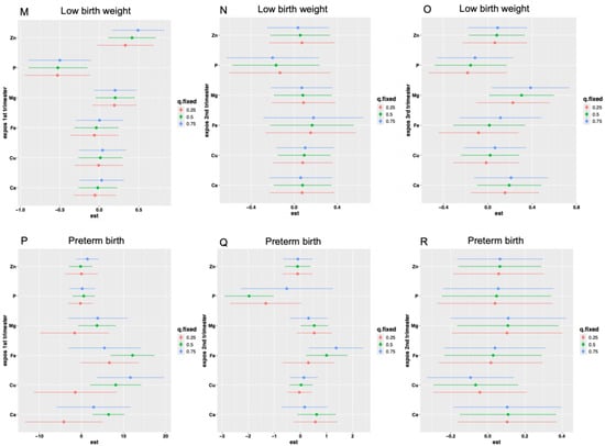 Estimated effect at 95% confidence interval in quartile of combined metal ion levels to explore windows of susceptibility to adverse perinatal outcomes. (A–C) Preeclampsia: Copper (Cu) showed a significant protective effect at the q0.75 quartile in the first trimester. In the third trimester, both Cu and calcium (Ca) exhibited protective effects at q0.75, while magnesium (Mg) showed a high-risk effect at q0.25. (D–F) Gestational diabetes: No significant effects from the metal ions were observed in any trimester. (G–I) Obstetric hemorrhage: Phosphorus (P) significantly reduced the risk across at least one quartile in all three trimesters, whereas iron (Fe) and Ca were associated with increased risk. (J–L) Neonatal intensive care admission: Zinc (Zn) was significant across all quartiles in the first trimester. In the third trimester, Ca was associated with an increased risk, while Cu reduced the risk at q0.5 and q0.75. (M–O) Low birth weight: In the first trimester, Zn was associated with an increased risk of a low birth weight, whereas P had a protective effect. (P–R) Preterm birth: In the first trimester, Cu was significant at q0.5 and q0.75, with Ca at q0.5 showing a high-risk effect. In the second trimester, Fe exhibited a high-risk effect at q0.5 and q0.75.