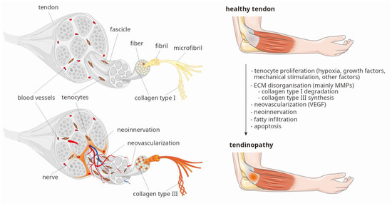 In response to tendon injury, platelets release growth factors (GFs), such as, vascular endothelial growth factor (VEGF), transforming growth factor (TGF-β), basic fibroblast growth factor (bFGF), platelet-derived growth factor (PDGF), and others [3,4,5,6]. Cytokines, mechanical stimulation, and hypoxia are the primary factors promoting increased tenocyte proliferation, neovascularization and neoinnervation of the damaged tendon areas [1,2,3,4,7,8]. Immediate increase in cellularity is accompanied by thinning and disorganization of the extracellular matrix (ECM), primarily resulting from changes in the ratio of type I collagen (COL1) to type III collagen (COL3), which limits the tendon’s ability to withstand stress [1,9,10,11]. COL1 constitutes a major proteinous component of healthy tendon, making up about 80–95%, while COL3 accounts for approximately 0–5% of its dry mass, respectively. In tendinopathy, an increased degradation of COL1 by collagenases and increased production of COL3 are observed [9,10,11]. It is known that matrix metalloproteinases (MMPs) are responsible for COL1 degradation, and their function is primarily regulated by tissue inhibitors of metalloproteinases (TIMPs) [1,11]. The balance between MMPs and TIMPs is crucial to maintain proper mechanical and biochemical homeostasis of tendons. While GFs release occurs within minutes after injury, inflammation, tenocyte proliferation, ECM disorganization, neovascularization, and neoinnervation occur over a period of several days to several weeks. The entire healing process, associated with tissue remodeling to restore the normal COL1 to COL3 ratio prior to injury can take several months to over a year [11,12]. The main structural changes in the tendon, observed in the first weeks after injury, are shown in Figure 1.