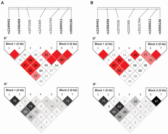 - Machiela, M.J.; Chanock, S.J. LDlink: A web-based application for exploring population-specific haplotype structure and linking correlated alleles of possible functional variants. Bioinformatics 2015, 31, 3555–3557. [Google Scholar] [CrossRef] [PubMed]