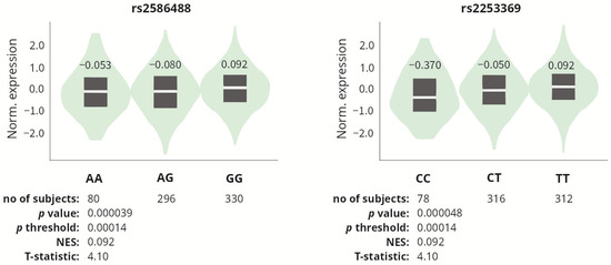 For each analyzed SNP, in silico analysis of expression quantitative trait loci (eQTL) was performed using the data obtained from the GTEx (The Genotype-Tissue Expression) Portal [51], to determine whether the studied polymorphisms affect COL1A1 expression. Since the GTEx portal does not contain data on tendons/tenocytes, we analyzed data on skeletal muscle tissue, which anatomically is closely related to the tendon and also derives from mesenchyme. Among the polymorphisms studied, only two affected COL1A1 gene expression, namely rs2586488 and rs2253369. The GG (rs2586488) and TT (rs2253369) genotypes were associated with increased COL1A1 expression in the skeletal muscle tissue as compared to its expression in other genotypes (Figure 4).