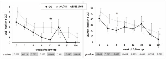 Medians (±QD) of VAS and QDASH values in respect to genotype variants of the COL1A1 gene rs35231764 polymorphism (recessive–dominant model). Legend: QD, quartile deviation; VAS, visual analog scale; QDASH, quick version of disabilities of the arm, shoulder and hand score; *, differences remaining significant after Hochberg correction for multiple comparisons (threshold of significance for recessive–dominant model: p ≤ 0.009).
