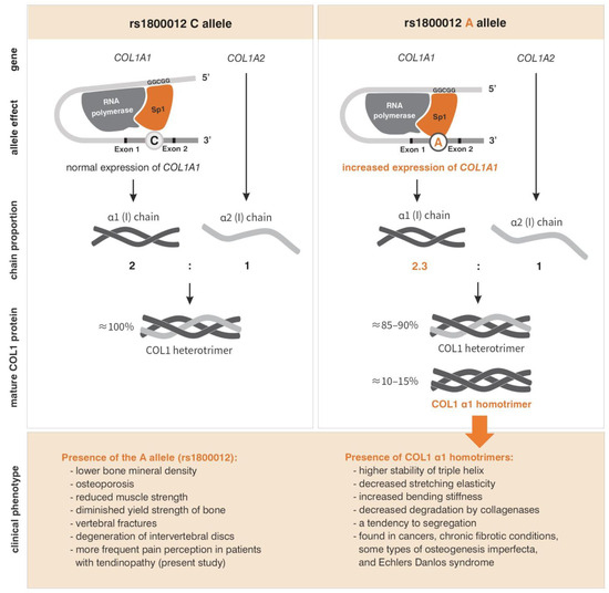 COL1 consists of two α1 polypeptide chains and one α2 chain. The α1 and α2 chains are produced by two separate genes, i.e., the COL1A1 gene (collagen, type I, alpha-1), located on chromosome 17 (17q21.33) [14], and the COL1A2 gene (collagen, type II, alpha-1), located on chromosome 12 (12q13.11) [15,16], respectively. Genetic variants of the COL1A1 are responsible for bone mineral density (BMD) variability and osteoporosis [17], Caffey disease [18], various types of osteogenesis imperfecta [19,20,21,22], and Ehlers—Danlos syndrome [23,24]. Reported data on the role of genetic variation of the COL1A1 gene in tendon and ligament biology mostly concern one single nucleotide polymorphism (SNP), namely rs1800012 (C/A). SNP rs1800012 is located in the first intron of the COL1A1, at the binding site of the transcription factor Sp1. When cytosine is replaced by adenine, the affinity of Sp1 for this site increases, leading to increased expression of the COL1A1 [25]. Initially, the minor allele A was shown to be associated with decreased risk of tendon injuries [26,27], although the results of reported studies [28,29,30,31,32,33,34], the conclusions of meta-analyses, and critical reviews [35,36] are inconsistent. Other studies demonstrated that in the musculoskeletal system the presence of the A allele appears to have a negative effect on muscle strength [37,38] and is associated with decreased BMD and osteoporosis [25,39,40,41,42], and intervertebral disc degeneration [43].
