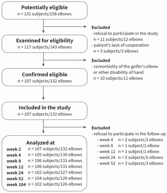 The patient group has been described in detail previously [45,46,47,48,49]. There was a group of 107 patients (132 elbows, 100%), with lateral elbow tendinopathy (M77.1., ICD-10), treated with PRP. The inclusion criteria were as follows: a diagnosis of tennis elbow confirmed by medical history, including pain at the common extensor origin radiating proximally and distally, reduced grip strength, pain and muscle weakness during lifting or holding objects, morning stiffness, positive Thomson’s and Mill’s tests, Cozen’s sign, tenderness over the lateral epicondyle of the humerus, symptoms persisting for at least three months before injection, and treatment with PRP. The exclusion criteria were additional injury/disease of affected limb, prior surgery or PRP injection, steroid injections in the last 6 months, rheumatoid arthritis, pregnancy, active malignancy, cervical radiculopathy, current anti-platelet medication and cognitive limitations. The flow-chart for patient selection is shown in Figure 8.