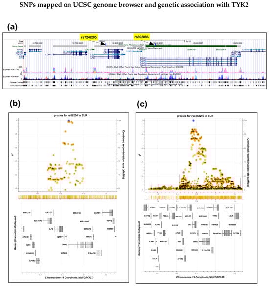An independent non-coding genetic association with Ps was identified ~400 kb upstream of TYK2. An UCSC browser image showed the variants making up the credible SNP set for rs892086 (R2 0.85) and another SNP, rs7248205 (R2 0.8), in their genomic context [] (Figure 1a). This provided more evidence that these variants may have the potential to influence TYK2 expression by interacting with regulatory elements involved in gene regulation. The image also shows relevant ENCODE histone and DNA accessibility data. The SNPs were mapped using LD Proxy for a European population. An independent non-coding genetic association with Ps was identified (Figure 1b,c).