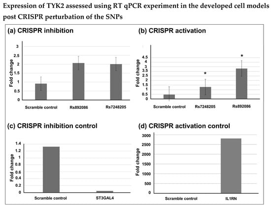 The expression of TYK2 was assessed using the RT qPCR experiment. TYK2 gene expression was measured using quantitative real-time PCR. The results from the inhibition experiment are shown in (a). The results from the CRISPR activation experiment are shown in (b), comparing the SNPs rs892086 and rs7248205 with the scramble negative control. IL1RN and ST3GAL4 were used as positive controls for the CRISPR activation and inhibition experiments, respectively, and are shown in (c,d). The expression of genes can be seen as a fold change in the graph. Triplicates were used for each test. The fold change was measured using the 2−∆∆Ct method by normalising the geometric mean of the Ct values of the housekeeping genes GAPDH and YWHAZ and the variation between genes. Data were normalised against the background. Experiments were analysed using a t test and non-parametric Mann–Whitney test (* p < 0.05). Data are presented as means +/− SD and are representative of 3 independent experiments.