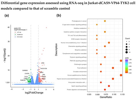 The effect on whole-genome expression post CRISPR activation and inhibition experiments perturbing TYK2 was assessed using RNA-seq. Jurkat-dCAS9-VP64 and Jurkat-dCAS9-KRAB CD4 T cells were used for the CRISPR activation and inhibition experiments, respectively. For the purposes of the RNA-seq experiments, Jurkat-dCAS9-VP64-TYK2 and Jurkat-dCAS9-VP64 scramble control cells were expanded in a culture in triplicate, and total RNA was used for RNA-seq. Overall, 184 genes were observed to be upregulated, and 58 genes were observed to be downregulated.