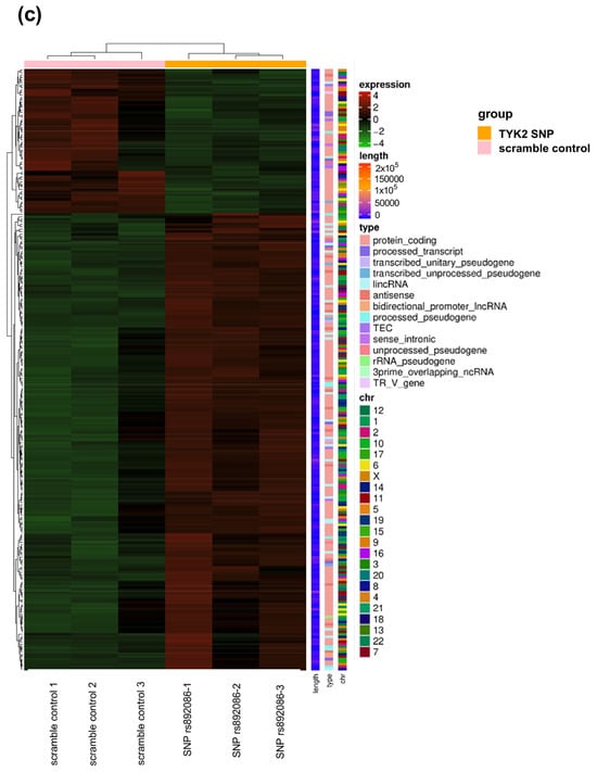 Cytokine–cytokine receptor interaction, the C-type lectin receptor signalling pathway, Th1 and Th2 cell differentiation, the cytokine signalling pathway, focal adhesion, the apelin signalling pathway, protein digestion, and the absorption pathways were observed to be enriched, as shown in Figure 3b. A heatmap comparing Jurkat-dCAS9-VP64-TYK2 and the Jurkat-dCAS9-VP64 scramble control is shown in Figure 3c, demonstrating differences in the gene sets between the triplicates from each sample set.