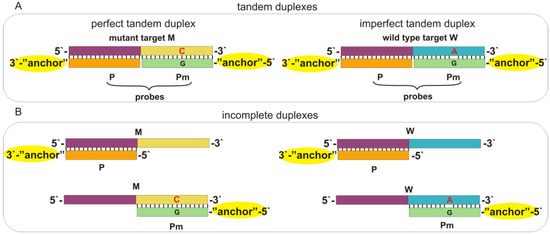 Duplexes formed by probes P and Pm and targets M (mutant) and W (wildtype) for the purpose of detection of the single-nucleotide polymorphism (SNP) in Mycobacterium tuberculosis (MTB): tandem duplexes upon cooperative binding/hybridization of both probes to a target (A) or incomplete duplexes containing only one probe (B). Different colors correspond to different DNA sequences.