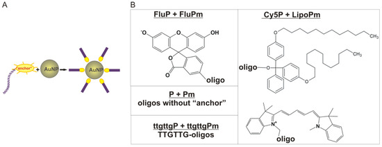 (A) The model of adsorption of “anchor” oligonucleotide probes on gold nanoparticles (AuNPs) and (B) names of probes and “anchor” structures in the probes.