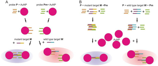 Two fundamental schemes for detecting a SNP using AuNPs are theoretically possible and are described in the literature [20,42,43,44] (Figure 3).