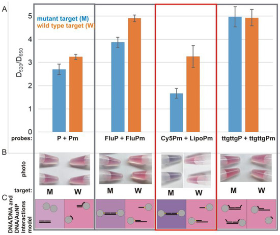 Different levels of differentiation between the mutant target (M) and wildtype target (W) by means of probes P and Pm, carrying different anchors or devoid of them. A histogram of optical density at 520 nm to optical density at 650 nm (D520/D650) ratios (A), photos of samples in test tubes (B), and a schematic representation of the adsorption processes and of the formation of duplexes of various compositions in samples containing two different targets (C). The background color matches the color of real samples, thereby emphasizing the feasibility of their visual discrimination.