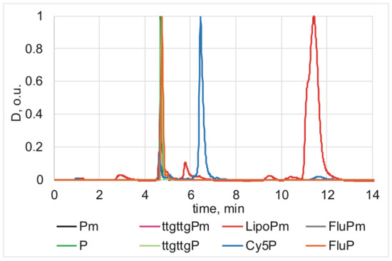 The use of more hydrophobic anchors in the probes (namely, the combination of the didodecyltrityl group at the 5′-end of probe Pm and the Cy5 residue at the 3′-end of probe P) caused more pronounced aggregation in samples containing the mutant target. This is because adsorption of these tandem duplexes was more efficient, as compared to other types of anchors and to the wildtype target (Figure 4). The hydrophobicity of the probes was assessed via a comparison of the retention times among the oligonucleotides on a column during elution with an acetonitrile gradient. One can see that the introduction of the didodecyltrityl group into probe Pm significantly increased the retention time, from 4.67 to 11.41 min, and the introduction of the Cy5 residue into double probe P also extended the retention time, to 6.43 min (Figure 5).