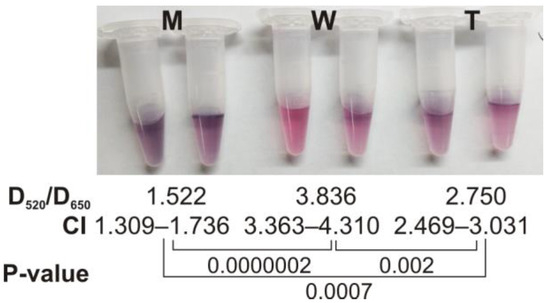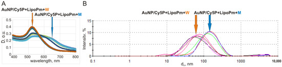 The hydrodynamic diameter differed by almost two-fold between AuNPs’ associates with target M and those with target W (Figure 6A). This observation theoretically fully matched the formation of AuNP aggregates. Figure 6B clearly illustrates the spectroscopic difference between the two types of samples.