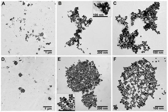 Statistical analysis of the Au core diameter was performed based on TEM images. Associates of AuNPs with probes and with target M or W had a spherical shape and an Au core diameter of 14.6 ± 1.9 nm for samples with the M target and 14.6 ± 2.4 nm for samples with the W target (Figure 7), which corresponded to the size of the initial citrate-generated AuNPs (14.4 ± 1.9 nm), so no statistically significant differences were found between the initial Au cores and Au cores modified with targets (p-value > 0.05). AuNPs/M/probes were arranged on the supporting film mainly in irregularly shaped clusters, which were single-layered or multi-layered in some regions. Sizes of clusters varied from 290 to 860 nm for samples with the W target and from 30 to 750 nm for samples with the M target. Single particles and clusters of several particles were present, too (Figure 7A–C).