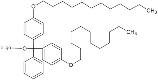 The product (Scheme 1II) was dissolved in 1.2 mL of dichloroethane, mixed with 2 drops of dimethylformamide and 0.06 mL of oxalyl chloride, and stirred for 1 h. The product was evaporated under reduced pressure, thus yielding 0.38 g of 4,4’-(chloro(phenyl)methylene)bis((dodecyloxy)benzene) (yield 42%). 1H NMR (80 MHz, CDCl3, δ, ppm): 7.52–6.52 (m, 13H), 1.68 (br.s., 4 H), 1.23 (br.s., 40H), 0.83 (br.s., 6H) (Scheme 1III).