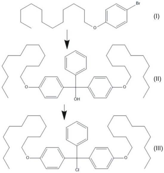 4,4’-(Chloro(phenyl)methylene)bis((dodecyloxy)benzene) synthesis. Structures of the initial compound 1-bromo-4-(dodecyloxy)benzene (I), the intermediate product 4,4’-(hydroxy(phenyl)methylene)bis((dodecyloxy)benzene) (II), and the final product 4,4’-(chloro(phenyl)methylene)bis((dodecyloxy)benzene) (III) are shown.