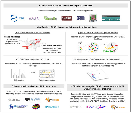 Herein, we set out to identify the LAP1 protein interactome using bioinformatics- and proteomics-based approaches, as well as to characterize the functional properties of LAP1-interacting proteins in order to shed light into the biological roles of LAP1 and its importance in human physiology. In addition, we undertook a comprehensive analysis to uncover relevant physiological and pathological associations between these LAP1 interactors and the deregulated proteins found in patient-derived LAP1-deficient fibroblasts bearing the disease-causing LAP1 E482A mutation, the latter of which were recently reported in a study from our group [32]. The experimental design of the present work is summarized in Figure 1.