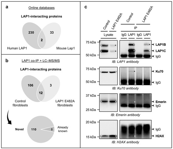 Identification of LAP1-interacting proteins. (a) Summarized results of the in silico analysis leading to the identification of previously known interacting proteins of human LAP1 and mouse Lap1, retrieved from online databases. (b) Summarized results of the LC–MS/MS analysis leading to the identification of proteins that were significantly co-immunoprecipitated with LAP1 in control and LAP1 E482A fibroblast cell lines. The number of novel LAP1-interacting proteins uncovered in control fibroblasts is also indicated. (c) LAP1 co-immunoprecipitation assay coupled to immunoblotting analysis validating several LC–MS/MS-identified proteins as LAP1 interactors in control fibroblasts. Whole cell lysates obtained from control and LAP1 E482A fibroblast cell lines were immunoprecipitated using a LAP1-specific antibody bound to Dynabeads Protein G. The respective negative controls were performed by incubating fibroblasts’ total protein extracts with Dynabeads Protein G-conjugated rabbit IgG. The presence of LAP1 and/or its binding partners Ku70, emerin and H2AX in the immunoprecipitates (right), as well as in the initial whole cell lysates (left), of control and LAP1 E482A fibroblasts was analyzed by immunoblotting using specific antibodies against the human target proteins; asterisks indicate visible LAP1B, LAP1C, Ku70, emerin and H2AX protein bands. IB, immunoblotting; IgG, immunoglobulin G; IP, immunoprecipitation; LAP1, lamina-associated polypeptide 1; LC–MS/MS, liquid chromatography coupled to tandem mass spectrometry.
