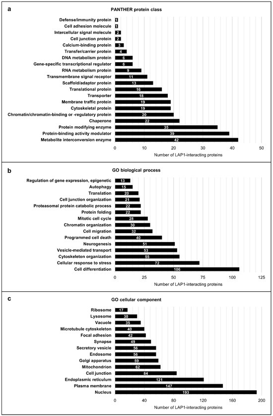 After identifying the LAP1 protein interactome using both in silico and experimental strategies, the data collected from online databases (Supplementary Tables S1 and S2) were combined with the LC–MS/MS data obtained from the analysis of control fibroblasts (Supplementary Table S3) to achieve the final working list of LAP1 interactors, comprising a total of 375 human proteins. To have a deeper understanding on which cellular activities might be regulated by LAP1 via association with its binding partners, we utilized bioinformatics tools to perform a global functional characterization involving all LAP1-interacting proteins (Figure 3; Supplementary Tables S5 and S6). In a first analysis, these were classified based on the protein classes that they integrate by employing the Protein ANalysis THrough Evolutionary Relationships (PANTHER) online resource [33], which retrieved protein class annotations organized into 20 main categories for 288 mapped proteins (Figure 3a; Supplementary Table S5). According to the results, many LAP1 interactors belong to the protein classes of metabolite interconversion enzymes (e.g., oxidoreductases and glycosyltransferases), protein-binding activity modulators (e.g., G proteins) and protein-modifying enzymes (e.g., proteases, ubiquitin–protein ligases, protein kinases and phosphatases) (Figure 3a; Supplementary Table S5). Chaperones, chromatin/chromatin-binding or -regulatory proteins, cytoskeletal proteins (e.g., microtubule/microtubule-binding and actin-binding proteins), membrane traffic proteins, transporters and translational proteins (e.g., ribosomal proteins and translation factors) were also among the most represented protein class categories attributed to the interaction partners of LAP1 (Figure 3a; Supplementary Table S5). In addition, a smaller number of these proteins were grouped, for example, in the protein classes of transmembrane signal receptors, RNA metabolism proteins, gene-specific transcriptional regulators (e.g., DNA-binding transcription factors) and DNA metabolism proteins (Figure 3a; Supplementary Table S5).