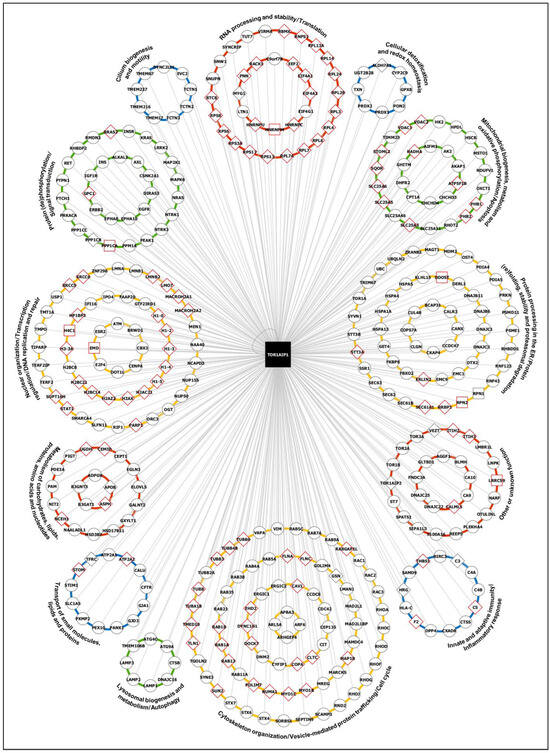 Using the analytical approach mentioned in Section 2.1.4, the list of 386 differentially expressed proteins detected in LAP1 E482A versus control fibroblasts [32] was organized into the same 13 functional protein groups (Supplementary Table S49) as performed initially for the list of LAP1 interactors (Supplementary Table S48). Afterwards, we performed a bioinformatic analysis of each group to explore both physical and functional associations of the deregulated proteins uncovered in LAP1 E482A fibroblasts with the LAP1-interacting proteins (Figure 5 and Figure 6; Supplementary Figures S3–S13). Based on the PPI data retrieved from the STRING database [34], it was possible to perceive that there exists ample interconnectivity between the LAP1 E482A fibroblasts’ differentially expressed proteins and the interaction partners of LAP1; this appears to occur particularly in the DNA- (Figure 5), RNA- (Supplementary Figure S3), proteostasis- (Figure 6), cytoskeleton- (Supplementary Figure S6) and signaling-related (Supplementary Figure S10) functional groups. Curiously, 12 LAP1 interactors were among the proteins exhibiting an altered expression pattern in LAP1 E482A fibroblasts (Figure 5 and Figure 6; Supplementary Figures S6–S8, S12 and S13), indicating that their deregulation could be directly correlated with LAP1 depletion; these include, for example: really interesting new gene (RING) finger protein 123 (RNF123), an E3 ubiquitin–protein ligase; the small G proteins Rab3B and Rab5C; filamins A and C, two actin-binding proteins; and the NE protein lamin B1. In an analogous way, it seems conceivable the idea that the altered abundance levels of other proteins, especially those physically/functionally connected to LAP1-binding partners (Figure 5 and Figure 6; Supplementary Figures S3–S8 and S10–S13), described in these patient’s cells could also be an indirect consequence of LAP1 deficiency. As such, envisioning a scenario wherein LAP1 forms physiologically relevant complexes with its interactors, which, in turn, associate with some of the proteins deregulated in LAP1 E482A fibroblasts, we hypothesized that the dysfunction of these different proteins could culminate in overlapping pathological phenotypes; this prompted us to carry out a gene–disease association analysis.