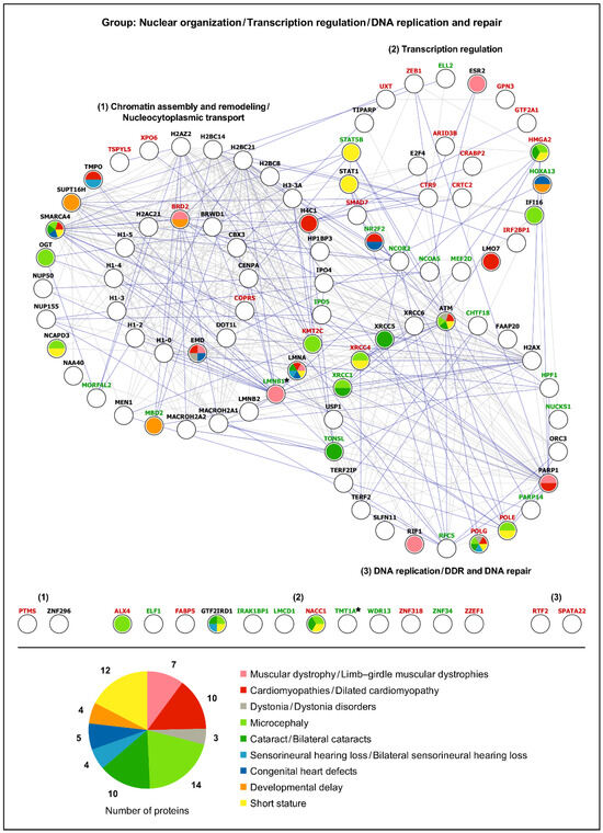 In order to decipher if the differentially expressed proteins detected in LAP1 E482A fibroblasts and the LAP1-interacting partners might be implicated in pathologies similar to the rare LAP1-associated nuclear envelopathies, the DisGeNET online platform [37] was used. Considering that TOR1AIP1 mutations leading to LAP1 deficiency have been shown to cause limb–girdle muscular dystrophy, dilated cardiomyopathy, dystonia, congenital myasthenic syndrome and a complex multisystemic disorder (characterized by microcephaly, developmental delay, bilateral cataracts, bilateral sensorineural hearing loss, congenital heart defects and growth retardation/short stature, among other variable clinical manifestations) [16,23,24,25,26,27,28,29,30,31], we restricted this in silico analysis to gene–disease associations between the proteins of each functional group and the referred diseases/pathological phenotypes (Supplementary Tables S50–S62), as explicated in the Materials and Methods section (see Section 4.6.2). The results revealed that a large number of the analyzed proteins are linked to cardiomyopathies/dilated cardiomyopathy (85 proteins), short stature (76 proteins), microcephaly (63 proteins) and cataract/bilateral cataracts (58 proteins) (Supplementary Figure S14). Additionally, a lower but still considerable portion of these proteins are associated with developmental delay (40 proteins), sensorineural hearing loss/bilateral sensorineural hearing loss (36 proteins), muscular dystrophy/limb–girdle muscular dystrophies (35 proteins), dystonia/dystonia disorders (32 proteins) and congenital heart defects (24 proteins), whereas only a few proteins are involved in congenital myasthenic syndromes (5 proteins) (Supplementary Figure S14). When establishing a comparison between the different functional protein groups, we noted that, in general, these exhibit pathological links to the various clinical conditions under analysis (Figure 5 and Figure 6; Supplementary Figures S3–S13; Supplementary Tables S50–S62), with a substantial part of the gene–disease associations being ascribed to the cytoskeleton- (Supplementary Figure S6; Supplementary Table S55), DNA- (Figure 5; Supplementary Table S50), signaling- (Supplementary Figure S10; Supplementary Table S59) and proteostasis-related (Figure 6; Supplementary Table S52) groups (87, 69, 61 and 52 associations, respectively). Contrasting with the more heterogeneous gene–disease associations observed in these functional groups, there is a predominance of cardiomyopathies among the pathologies linked to the immunity- (Supplementary Figure S8; Supplementary Table S57) and mitochondria-related (Supplementary Figure S5; Supplementary Table S54) groups.